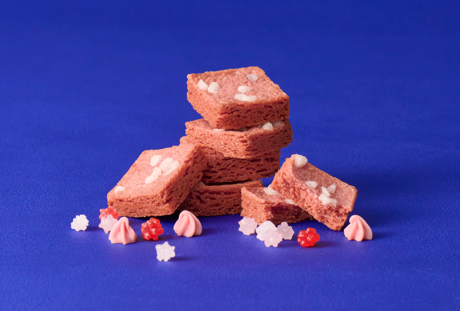 北海道産のバターと小麦粉、さらにアーモンドパウダーを使用した芳醇な厚焼きクッキーを、「ザクッ、ほろっ」と心地よい食感に仕上げました。そこに練り込んだストロベリーとラズベリーが、甘く爽やかなアクセントを奏でます。トッピングのパールシュガーは、まるで野花に降りた朝露のよう。正統派の美味しさの中に、つい手が伸びる愛らしさを詰め込んだ自慢の一品です。