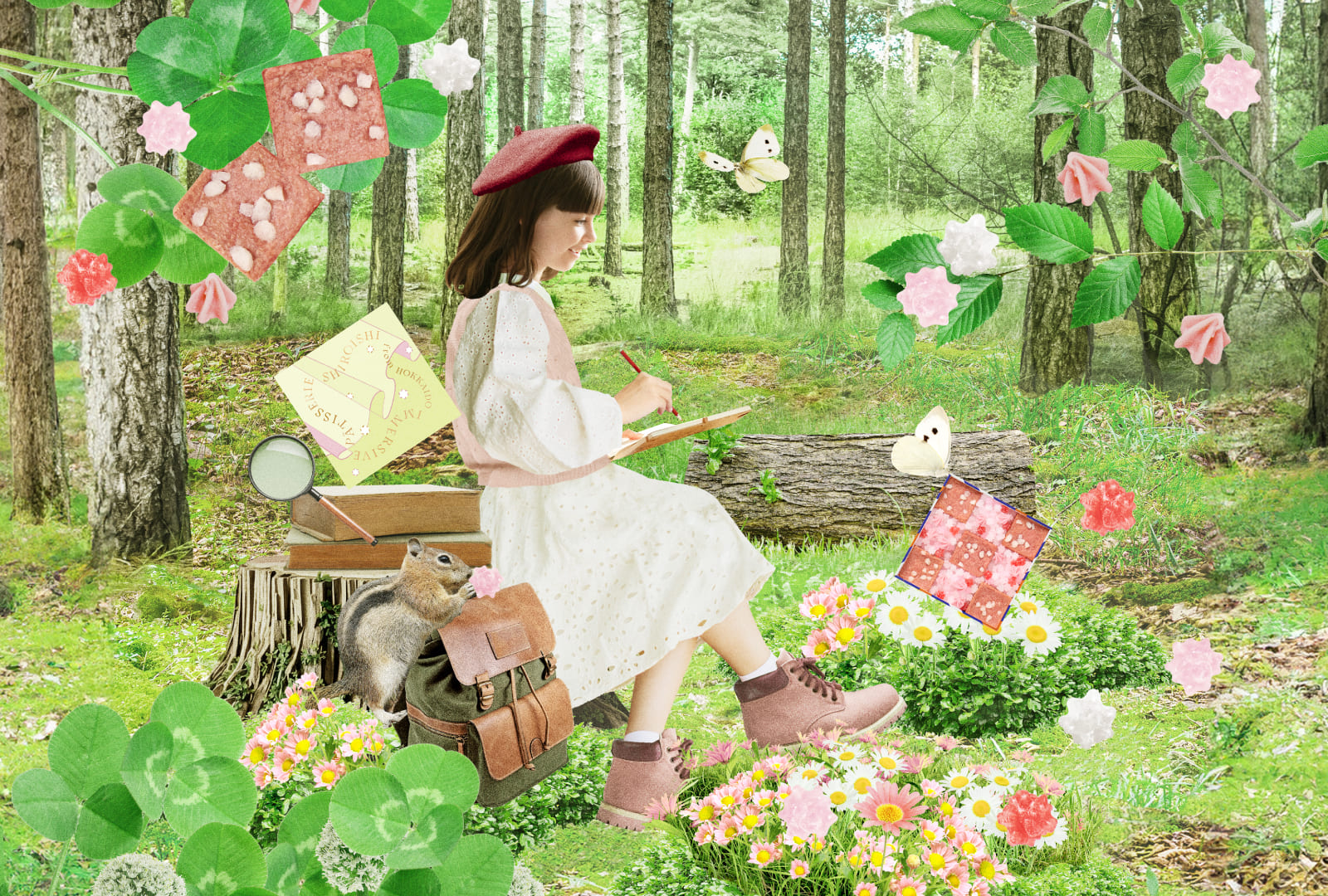 今回の物語の主人公は、“マンション・インディゴ”の305号室に住むマーガレット。お気に入りの水筒と、スケッチブック、それに『しろいし洋菓子店』のお菓子をカバンに詰めたら、ちいさな探検家マーガレットは森へ出発です!やわらかな風がマーガレット柄のワンピースをふわりと撫でていきます。そよ風はわずかに、甘い香りを乗せています。小さなお鼻をクンクン…その先には、ちらほらと小さな野花がほころんでいます。図鑑にも載っていない新しい花たち。「満開になったらママを招待しなくっちゃ」ほこらしげなマーガレットなのでした。